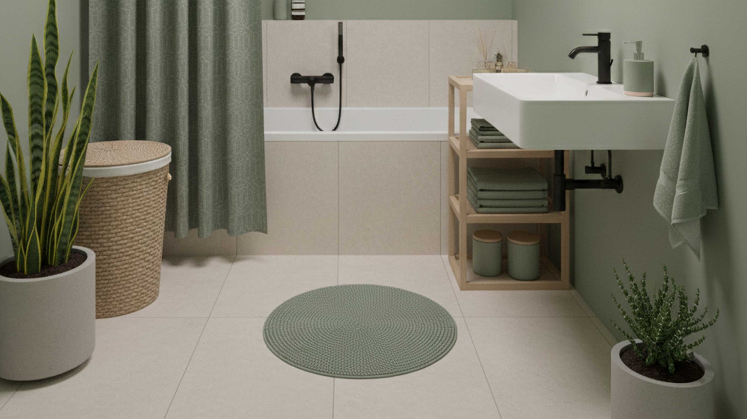 Auch bei den Armaturen kannst du den Stil gezielt betonen: Schwarze oder gebürstet-goldene Armaturen bilden einen starken, modernen Kontrast zu Salbeigrün und gelten 2026 als besonders angesagt. Wenn du es mutiger magst, dürfen es auch salbeigrüne oder andere pastellige Armaturen sein, die einzelne Highlights setzen und das Farbkonzept weiterführen. Ergänze den Raum mit Naturmaterialien wie Holz- oder Bambus-Accessoires, Leinenkörben und Keramikdosen und setze lieber wenige, größere Deko-Elemente ein, anstatt viele kleine Teile zu verteilen, damit das Bad ruhig und aufgeräumt bleibt.